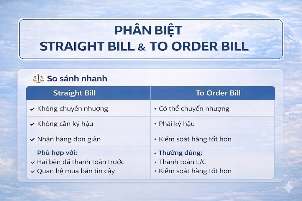 Trong vận tải biển, Bill of Lading (B/L) không chỉ là chứng từ vận chuyển mà còn quyết định quyền nhận hàng và mức độ kiểm soát hàng hóa. Hai loại phổ biến nhất là Straight Bill và To Order Bill.